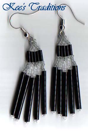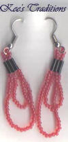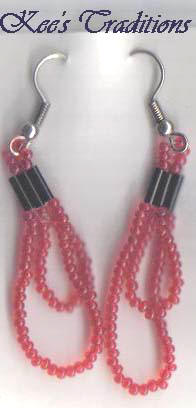 This pair of earrings is done in a simple dangle design and are about 2" long. The pair shown is done in #3 black bugles and size 11 translucent red glass seed beads. Like the ones above. I can do these in any color. Just e-mail me and ask if I have a certain set of colors.