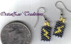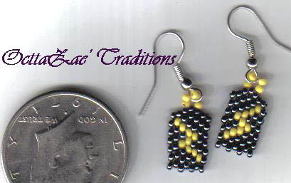 | This pair of earrings is created using brick-stitch and is done in a lightning bolt pattern. Beads used are size 11 glass beads. They are very short and light. The ones in the picture are done in Hematite gray (gunmetal) and yellow. I can do these in any color. Just e-mail me and ask if I have a certain set of colors. |