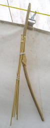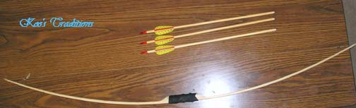 This Bow is made from Bamboo and grapevine, It is permanently strung with a plastic line. This bow is designed for a small child to start learning on. As it light weight and doesn't require any care. Range: 10 to 15 yards Max Draw length: 18" (drawing further could cause it to break) Ammo: Comes with 2 rubber tipped bamboo arrows. The rubber tips look like broad heads but are soft and safe. Quiver: Comes with a grapevine wrapped side quiver, which has a loop on one side so that you can run a cord thru and attach it to belt. Would also make a great costume piece or wall hanger. |