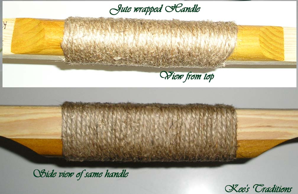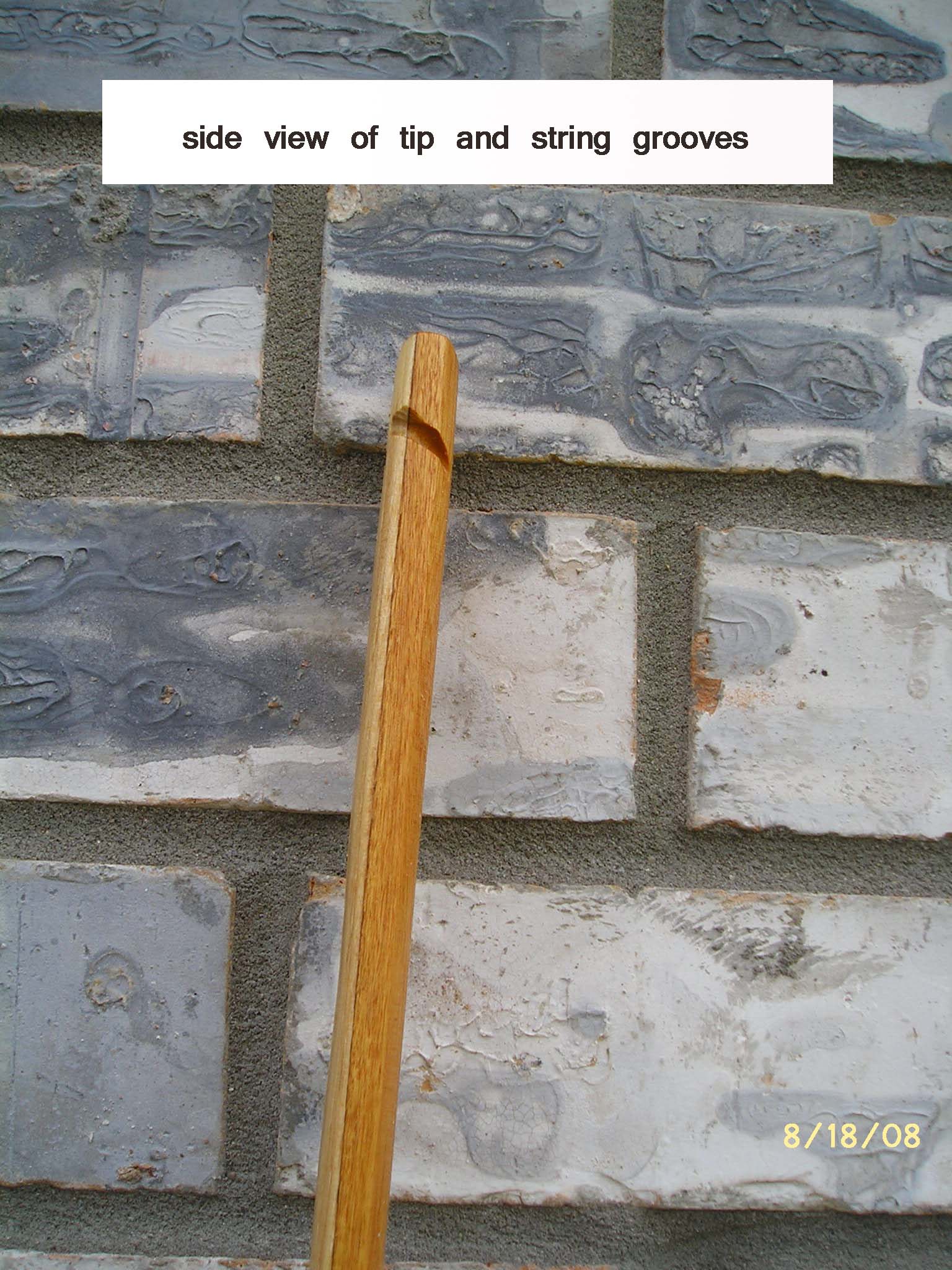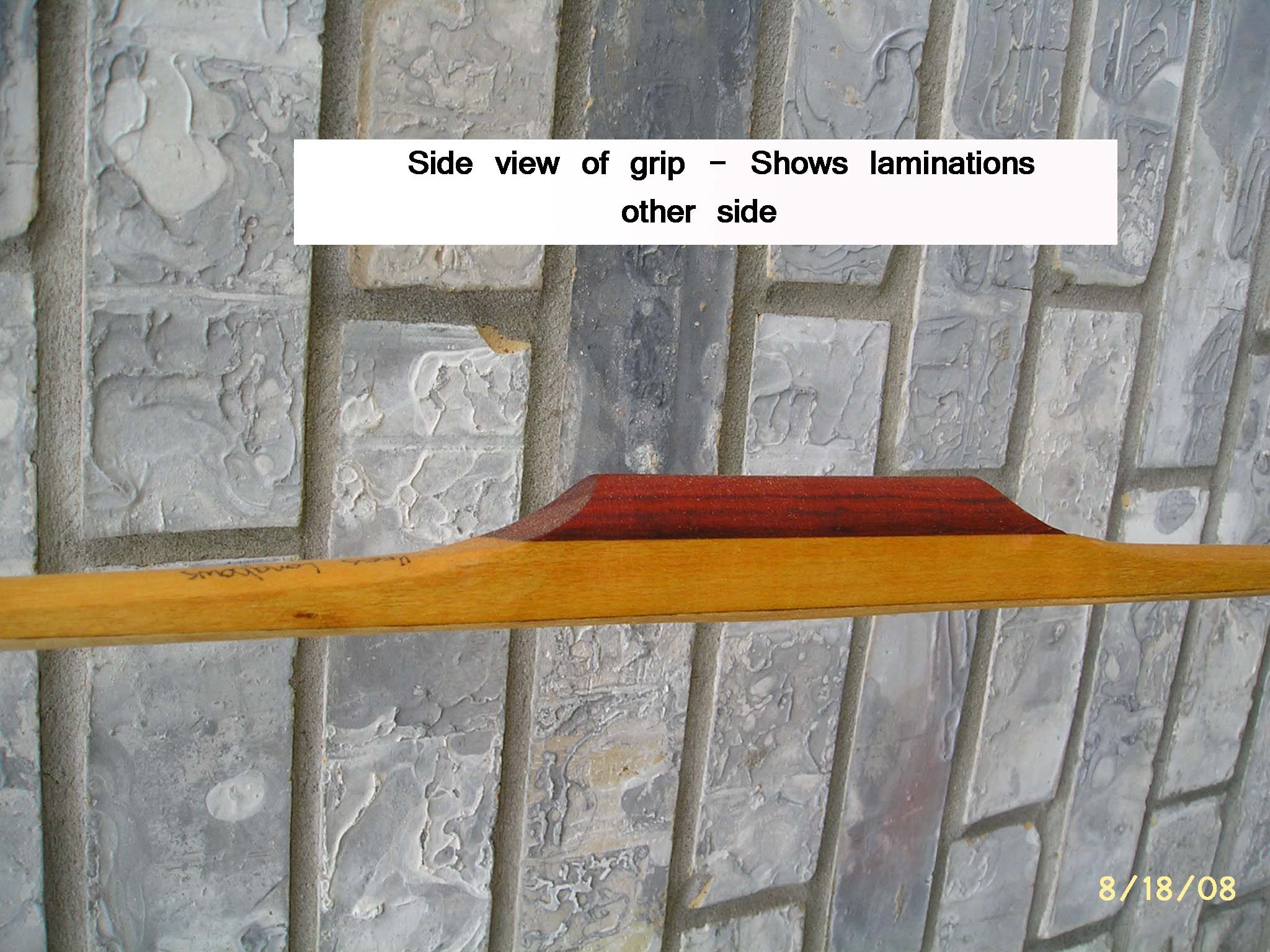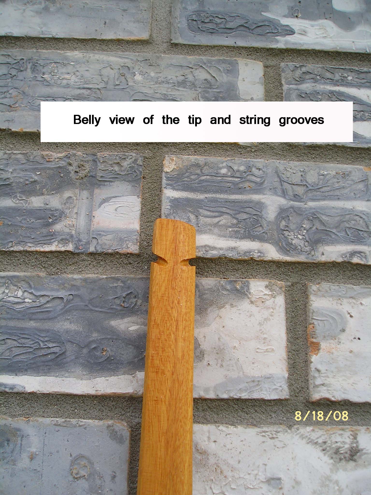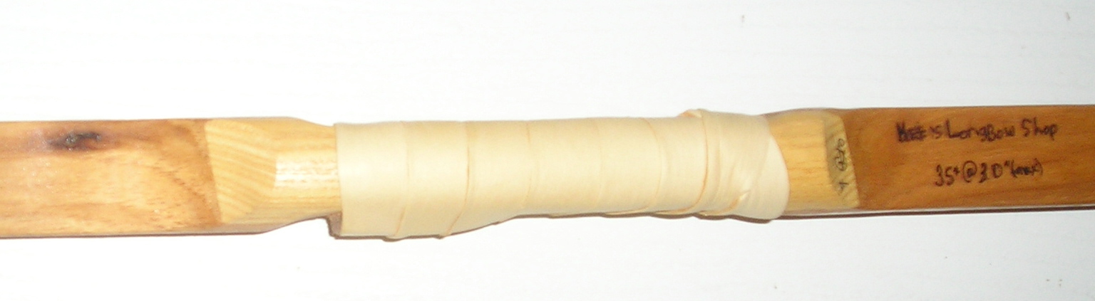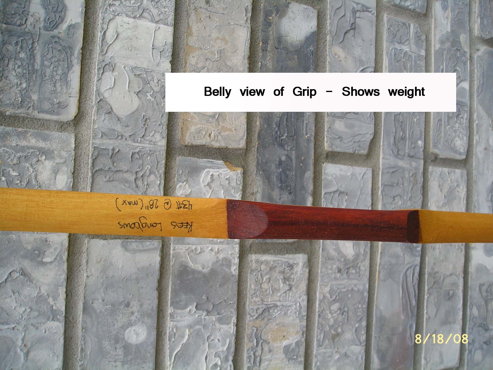 white to rich tan color depending on whether its sap or heart wood. The Belly of this bow is a beautiful piece of Red Oak, which is a pinky tan color. The Grips are all built up with another piece of wood and can be just about anything. The grip has been rounded so that it fits comfortably in almost any hand. The grip is built up to make it more comfortable to shoot, but not so much that it is uncomfortable. It is a medium size grip that people with small and large hands alike have found comfortable.