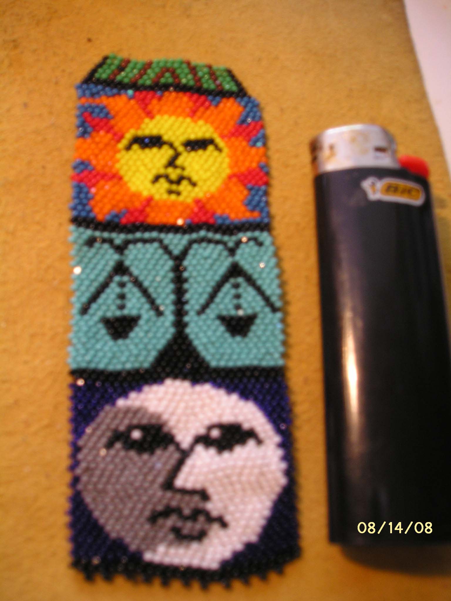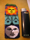 Here is another example of a custom made piece. This is a Bookmark that is made entirely of size 13 glass charlotte beads. I took pictures during several stages of completion as you can see. The Finished piece shows the Sun, Moon, Libra Star sign and a Mesa style mountain.
