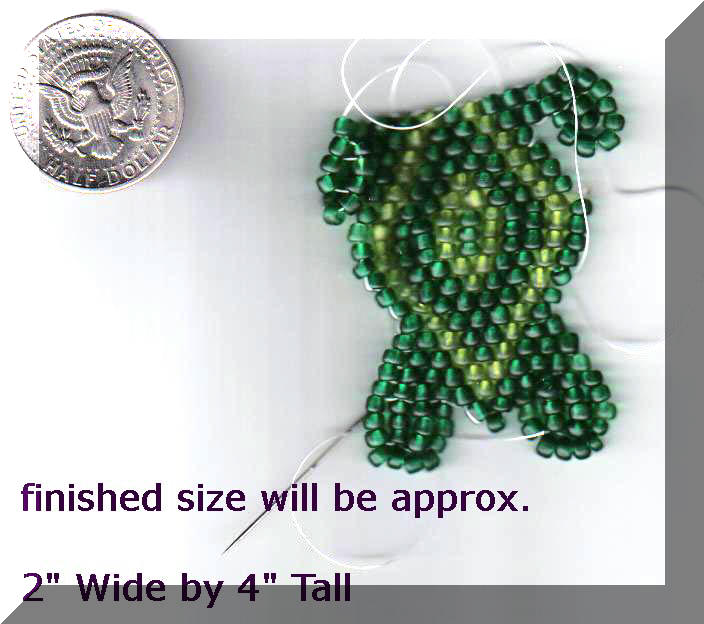 Example of a custom order. The person wanted a turtle done in sz. #6 glass beads. Which created a 2" Wide by 4" Tall turtle. Please note: Custom orders will have a different price than the item you are looking at if significant changes are requested (e.g. size, shapes) Price will not change if all you need is a different color combination on an item, size, shape already available. Please contact us if you have a special request, we will happily provide a quote if needed.