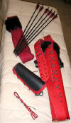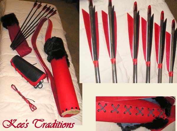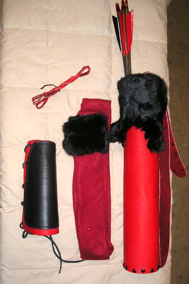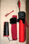 | This Set is the Black and Red Fantasy Set Hickory bow stained black with a red leather stitched grip, red sinew wrapped tips on the bow. 6 wood arrows also stained black and spine matched to the bow. Red and Black tradition cut feathers, red sinew wraps at the base of the feathers. 2 black and red flemish strings. 4" red leather back quiver with rabbit fur trim. Red leather armguard and bow stringer. Red elk string keeper. Red fleece bow sock with black rabbit fur trim.