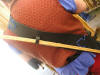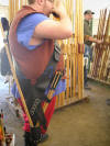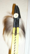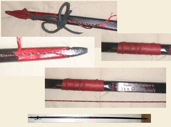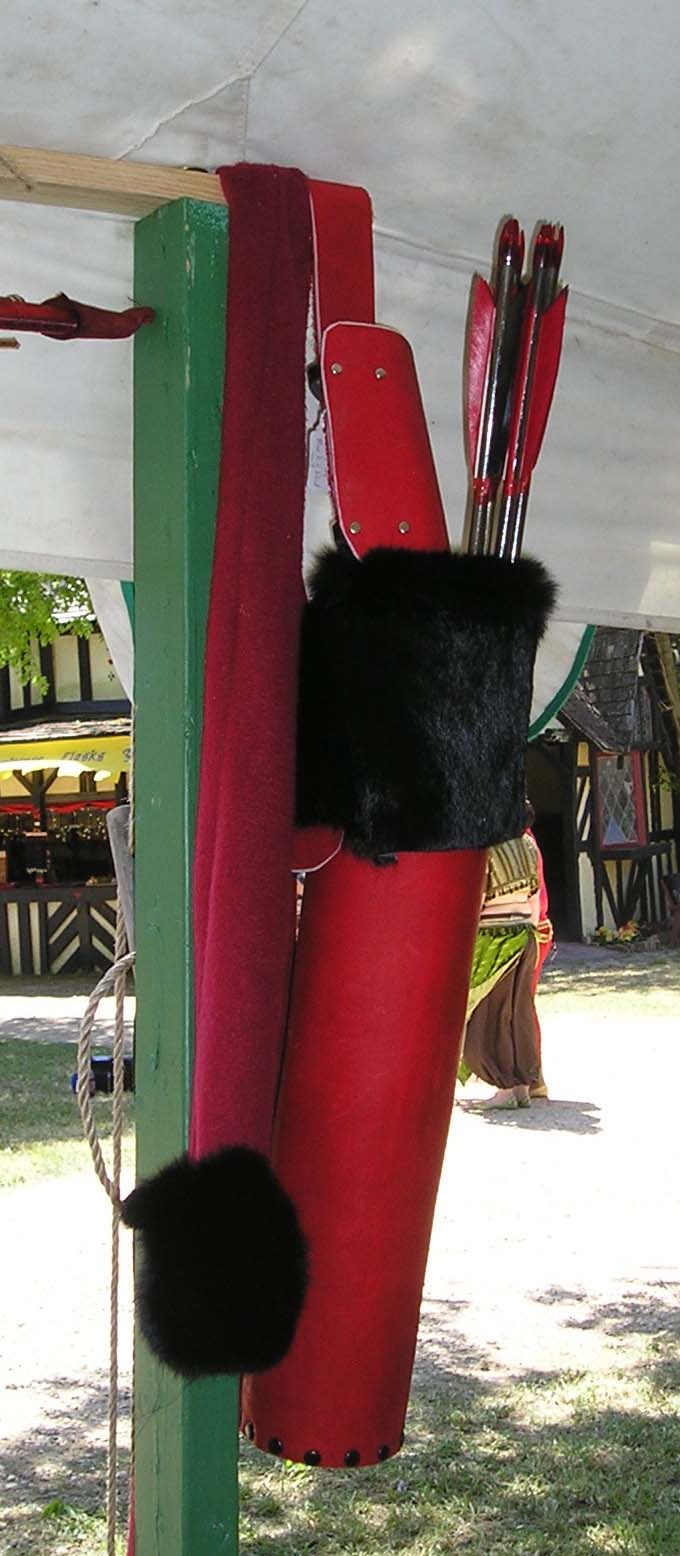 | This is a friend of mine who has one of our first youth size bows. He had the back of the bow done in henna and then sealed the bow permanently. The arrows you see in the quiver are also ones we made custom for the bow. The quiver and bow holder were not made by us. It was made by Excalibur leather at the Louisiana Renaissance Festival. |