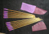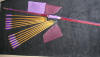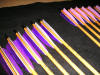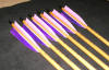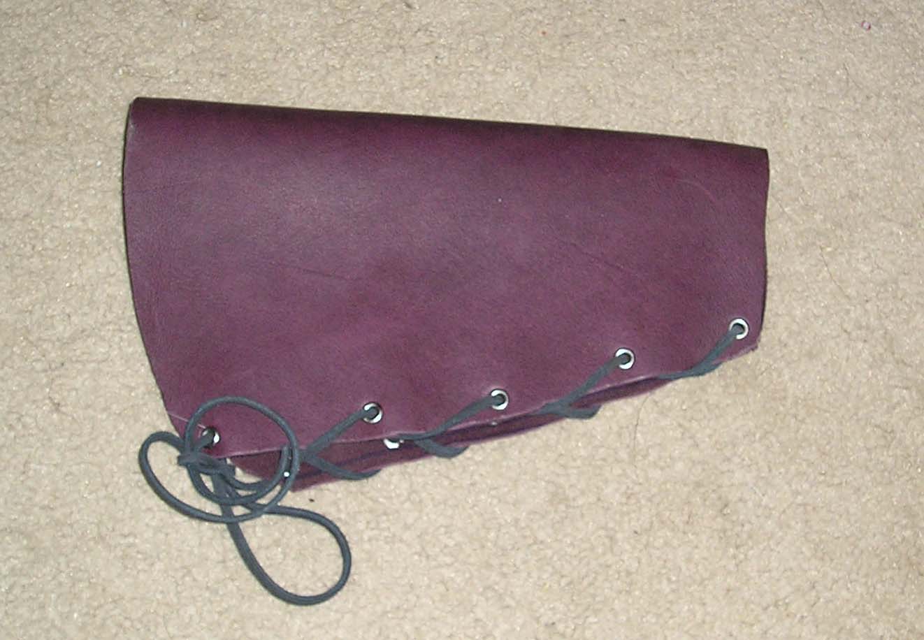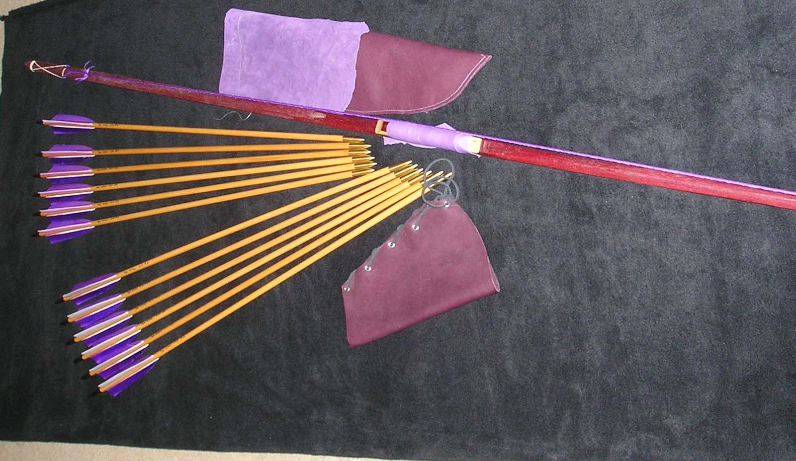 | This Set is called the "Sea Witch": It has a 30# Maple backed Purple heart bow with a birds eye Maple and Red heart riser (grip), grip wrapped in purple leather, 2 strings made from purple artificial sinew. One dozen arrows with Lavender and Royal Purple fletches. Black fleece bow sock with purple trim. Armguard and flat quiver made from wine purple buffalo. |