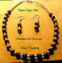 This pair of earrings and Necklace Set are made with 8mmTigers Eye Stone beads which vary in color (shades of brown with golden yellow streaks) and 4 mm Silver round beads. Necklace is 15 1/4 in long (or 33 1/2 cm) and has a lobster claw clasp closure The earrings are on surgical steel French hooks, but I can be switched to sterling hooks or Surgical steel posts. |