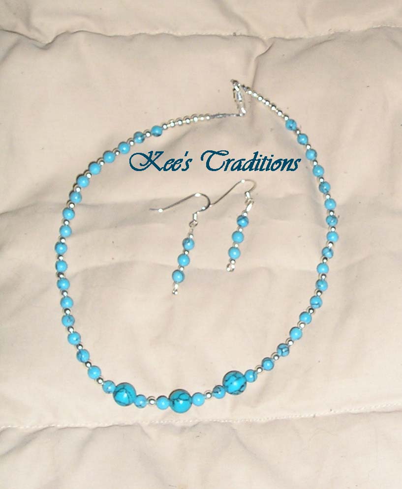 This pair of earrings and Necklace Set are made with 4 and 6mm Reconstituted Turquoise and Matrix Stone beads which vary in color (shades of blue with black streaks) and 4 mm Silver round beads. Necklace is 14 3/4 in long (or 37 1/2 cm) and has a barrel clasp closure The earrings are on surgical steel French hooks, but I can be switched to sterling hooks or Surgical steel posts.