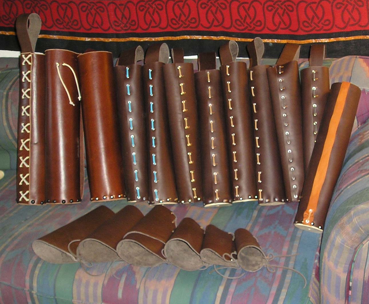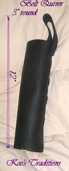(depending on what is available) Leathers. Most of the quivers are 16" to 18" Tall/Long and are 3" wide at the top. Theses are Tube style (type) back quivers They hold 1 to 2 dozen arrows and can be use with BROAD HEADS The Straps are approx 30" to 55" Long* depending on quiver by approx. 1 1/2" to 3" wide depending on the quiver Straps Are adjustable and will have either a BUCKLE or "D" rings. For the ones with buckles the holes are approx. 1" apart and have Brass or Nickel eyelets & rivets in them (to match which ever buckle in on the Quiver) , more holes and eyelets can be added to make the strap shorter. They are laced up the back ONLY, the front is smooth. Bottom is made of Pine or Cedar and is attached with Antique Brass, Brass, Black, Copper or Nickel tacks to match the other hardware on the quiver. Please contact for availability and colors!!