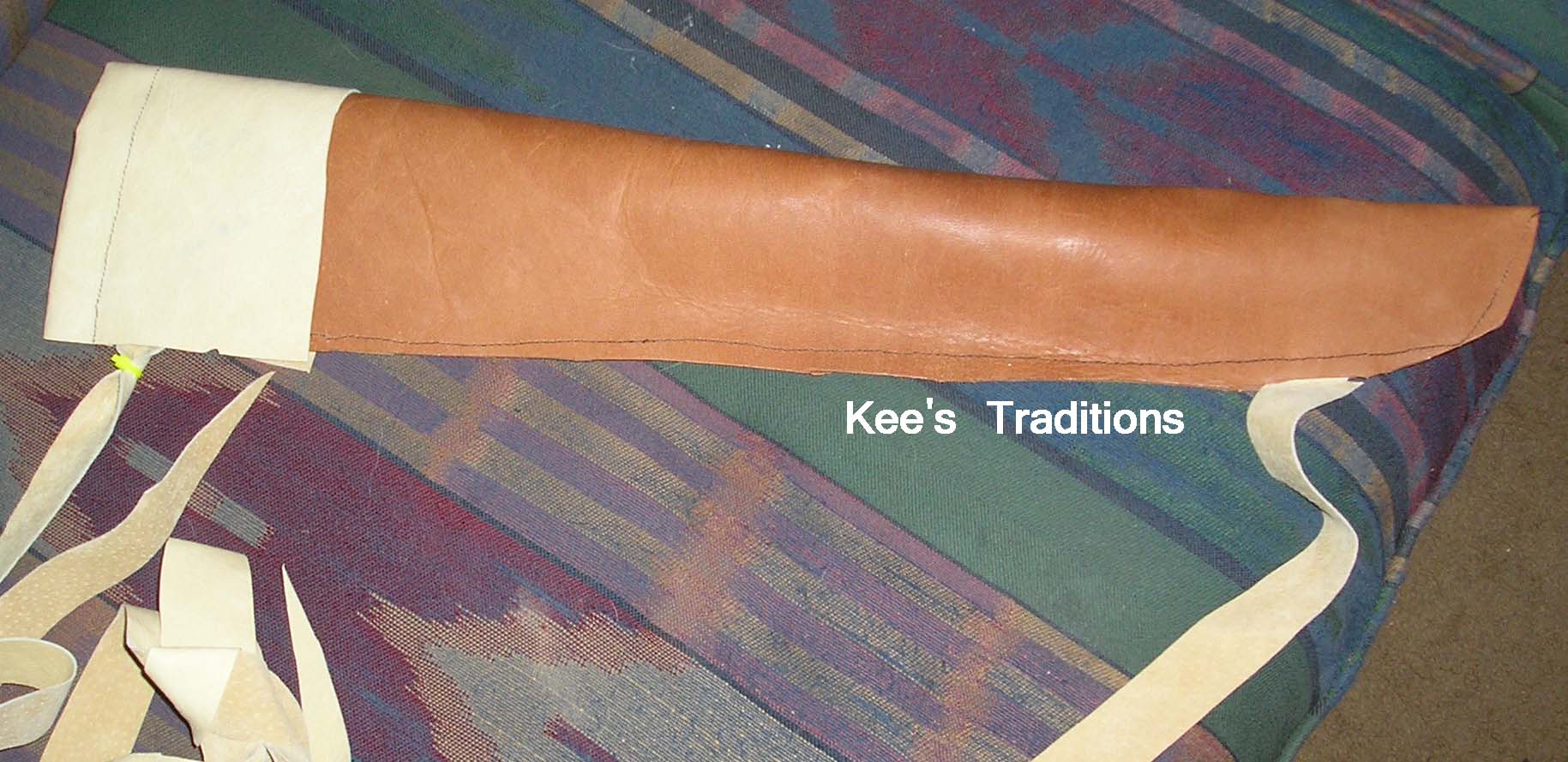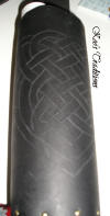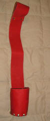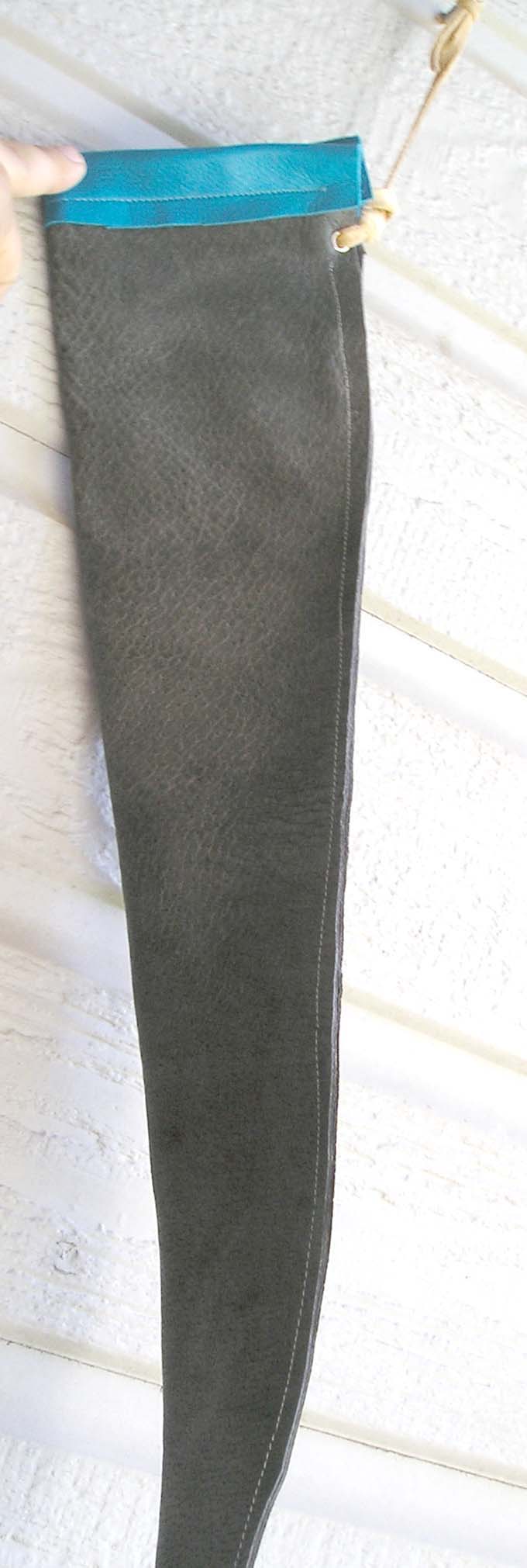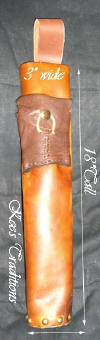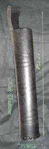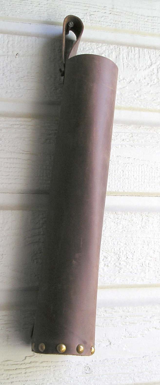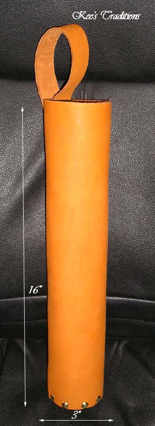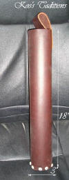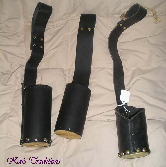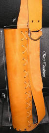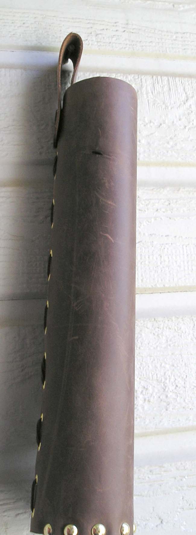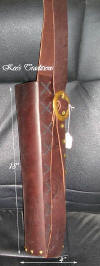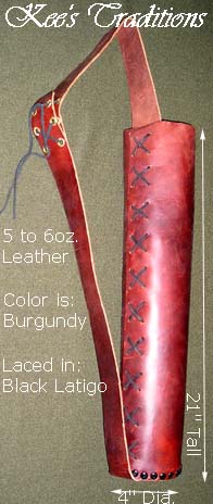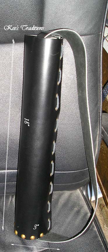 scrap leather or cloth. Each holds 1 to 1 1/2 dozen arrows. Each is made from approx. 5 to 6 oz. leather and has a pine wood bottom so that the arrows don't punch through. The cup portion varies in height from 3" to 6", finished quiver is usually 16" to 18" tall for use with 28" or longer arrows. May be Black or Burgundy Brown. Please contact for availability of colors. NOT RECOMMENDED FOR USE WITH BROAD HEADS OR BLADED POINTS Please see picture at left to see how to use. |