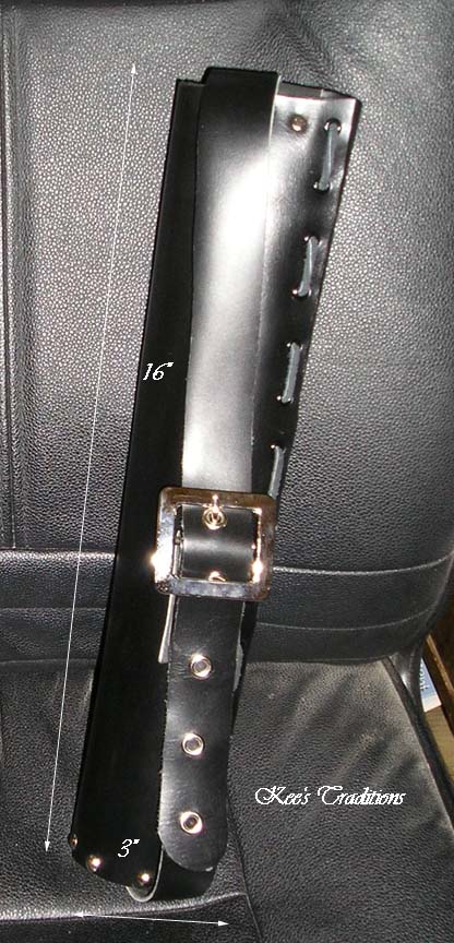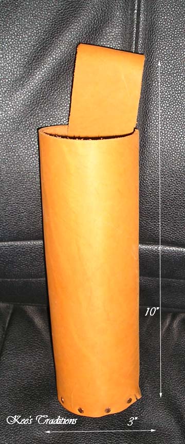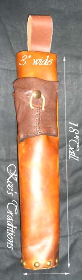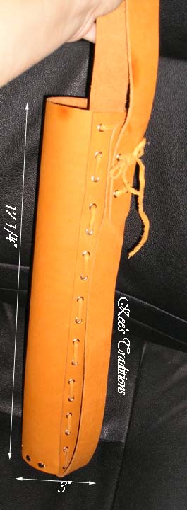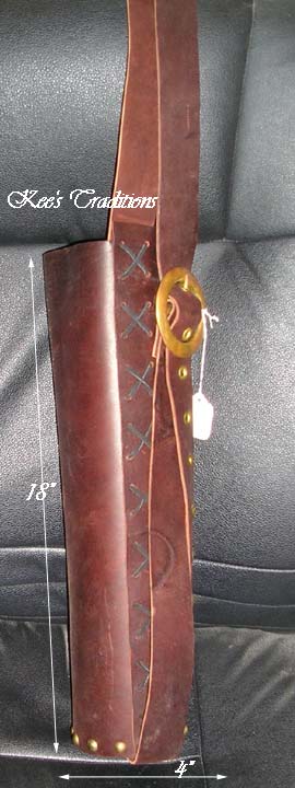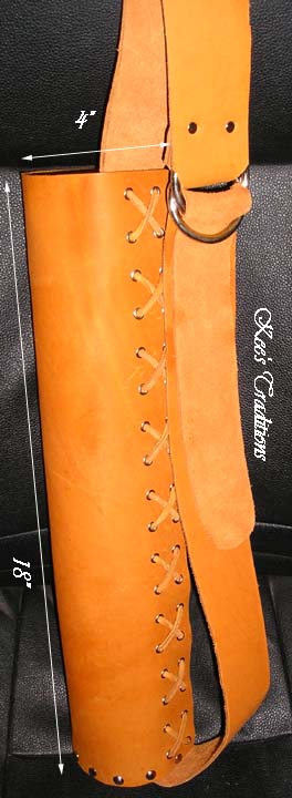 10 oz. (depending on what is available) Leathers. Most of the quivers are 18" to 20" Tall/Long and are 4" wide at the top. Theses are Tube style (type) back quivers They hold 3 to 3 1/2 dozen arrows and can be use with BROAD HEADS The Straps are approx 38" to 55" Long* depending on quiver by approx. 3" wide Straps Are adjustable and will have either a BUCKLE (picture #1) or "D" rings. (picture #2) For the ones with buckles the holes are approx. 1" apart and have Brass or Nickel eyelets & rivets in them (to match which ever buckle in on the Quiver) , more holes and eyelets can be added to make the strap shorter. They are laced up the back ONLY, the front is smooth. Most are laced in an "X" pattern. Bottom is made of Pine or Cedar and is attached with Antique Brass, Brass, Black, Copper or Nickel tacks to match the other hardware on the quiver. Please contact for availability and colors!!