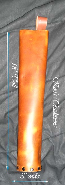 - Full Descriptions coming soon - These are new, hand crafted Wood bottom Leather Back Quiver. Most are 16" to 18" Tall/Long and are 3" wide at the top. Theses are Tube style (type) back quivers They hold 1 to 1 1/2 dozen arrows and can be use with BROAD HEADS The Straps are approx 30" to 45" Long *depending on quiver x approx. 2" wide and Are adjustable. Holes are approx. 1" apart and have Brass or Nickel eyelets in them, more holes and eyelets can be added to make the strap shorter. Bottom is made of Pine or Cedar and is attached with Antique Brass, Black or Nickel tacks.