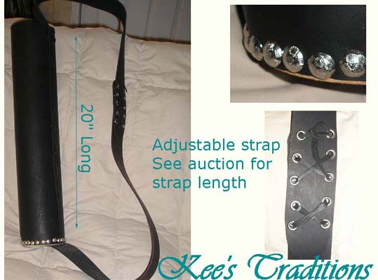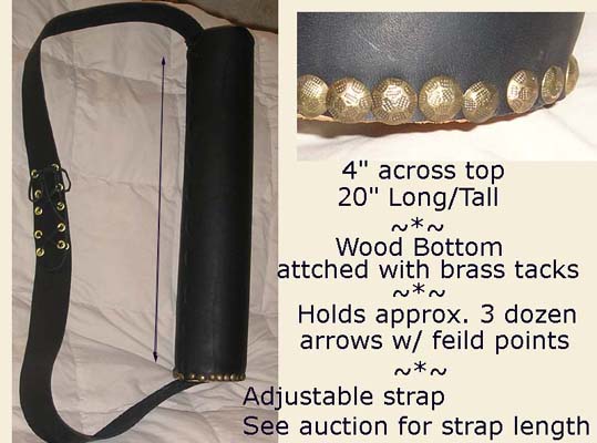 Theses are Tube style (type) back quivers They hold 3 to 3 1/2 dozen arrows and can be use with BROAD HEADS The Straps are approx 38" to 55" Long *depending on quiver by approx. 3" wide and Are adjustable. Holes are approx. 1" apart and have Brass or Nickel eyelets in them, more holes and eyelets can be added to make the strap shorter. Bottom is made of Pine or Cedar and is attached with Antique Brass, Brass, Black, Copper or Nickel tacks. Please contact for